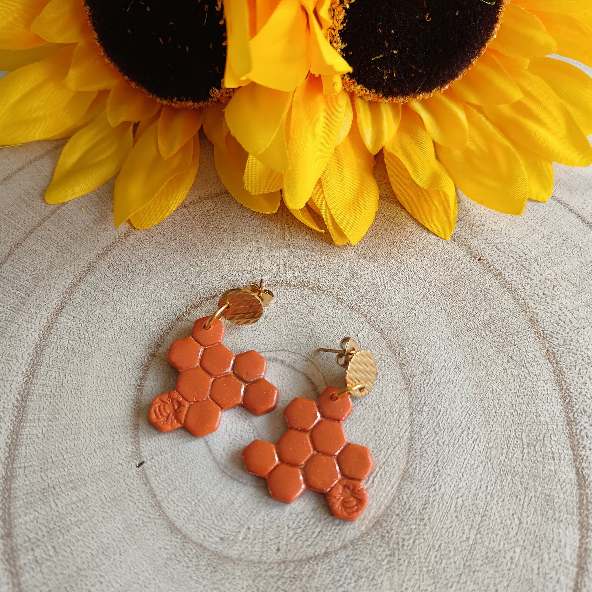 Bee & Honeycomb Orange & Gold Stud Earrings