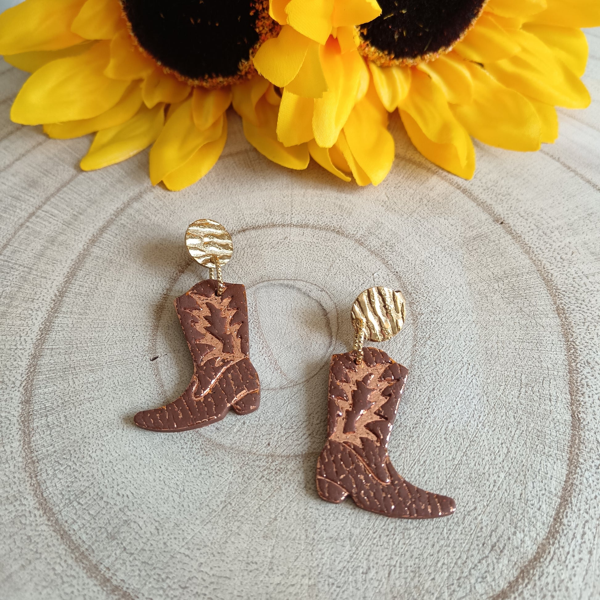 On Gold Stainless Steel Studs and handcrafted from polymer clay, these earrings combine the earthy ruggedness of well-worn leather boots with a touch of shimmering gold that catches the light in the most dazzling way. 🌟👢