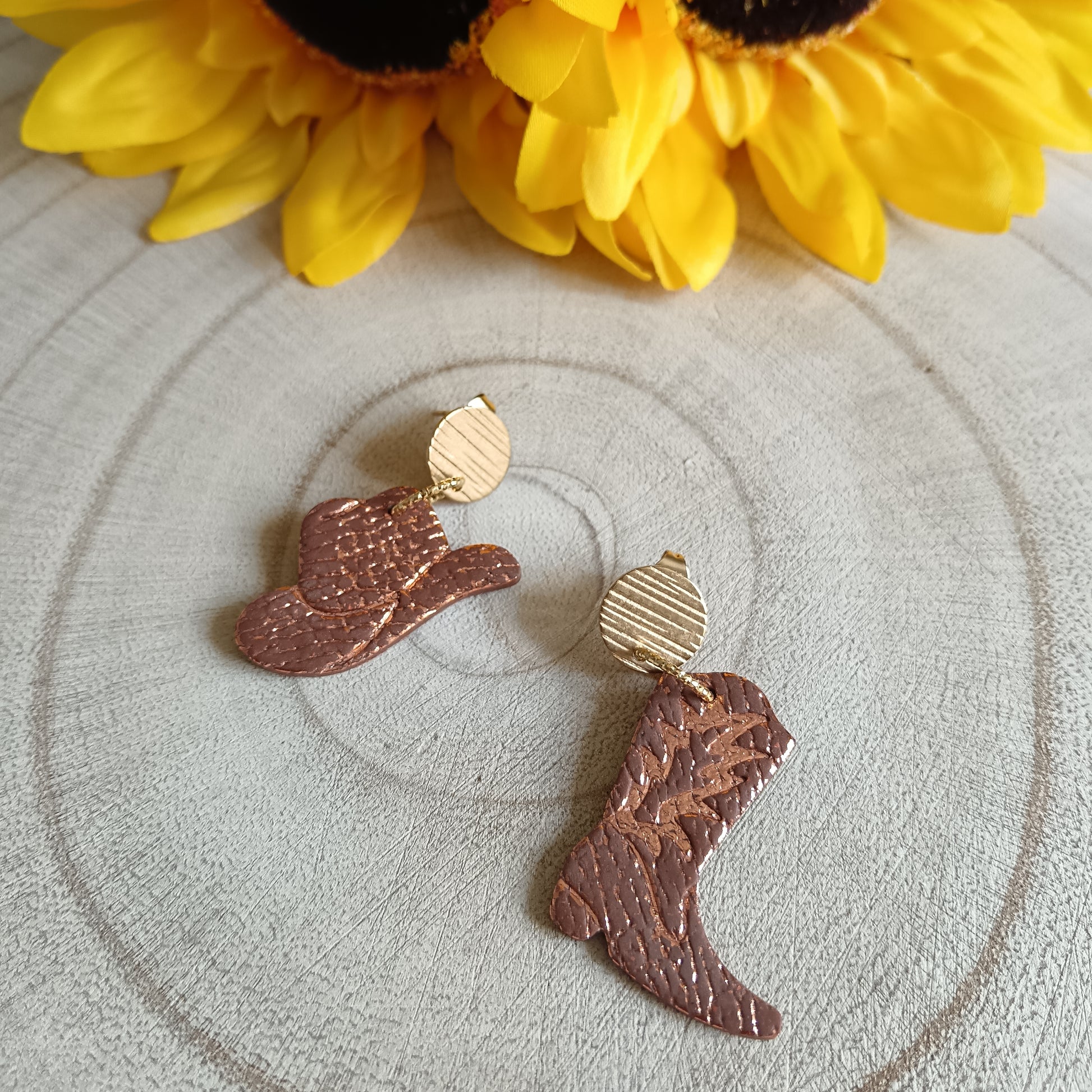🤠✨ Cowgirl Boots & Stetson Leather Texture Earrings with Orange Gold Glitter