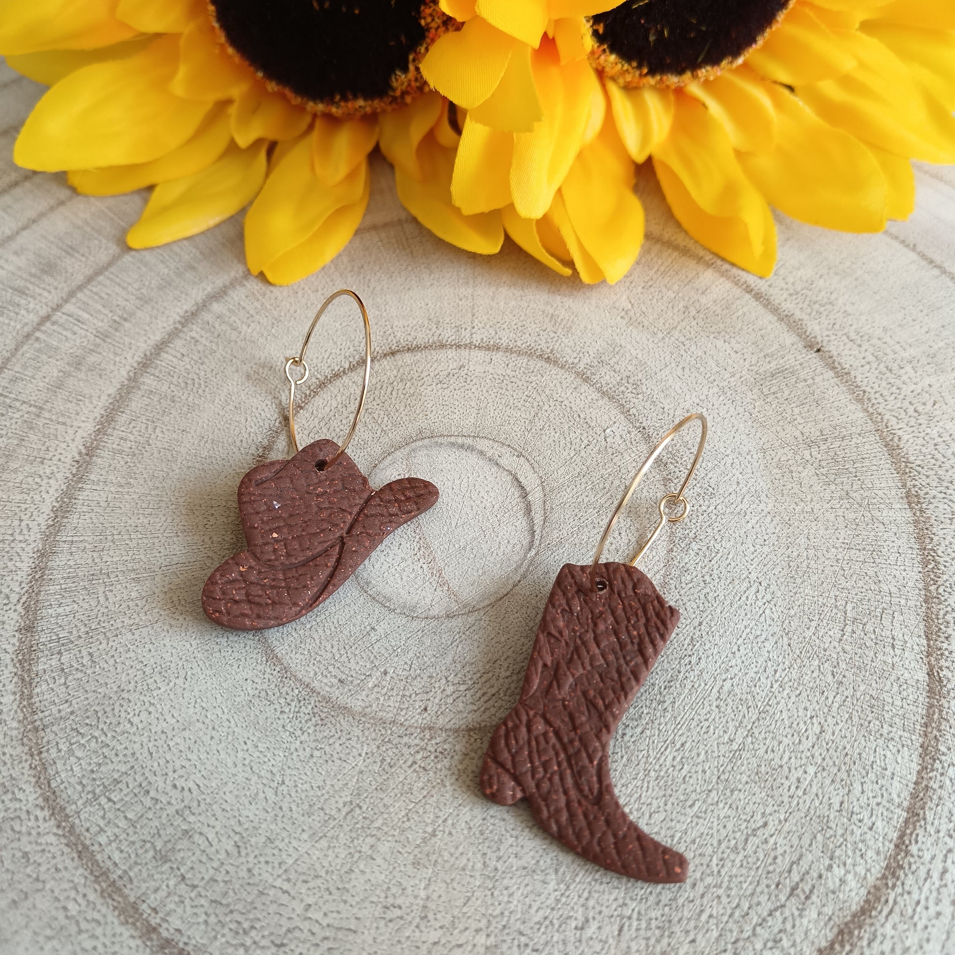 Get ready to channel your inner cowgirl with these brown leather texture cowgirl boots and Stetson earrings!