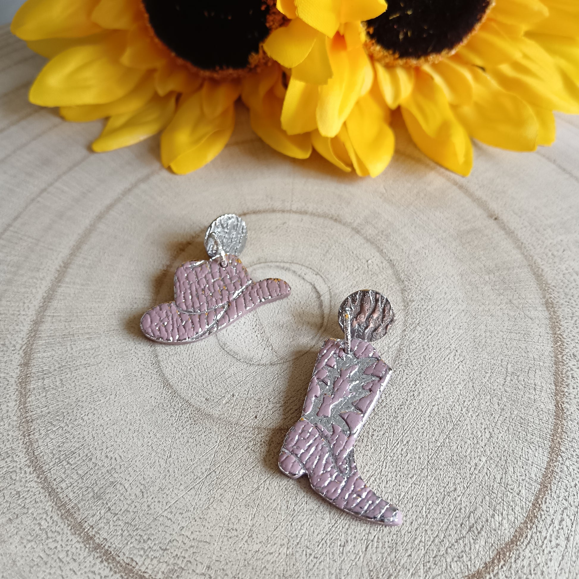 Cowgirl Boots & Stetson Leather Texture Pink & Silver Glitter Stud Earrings