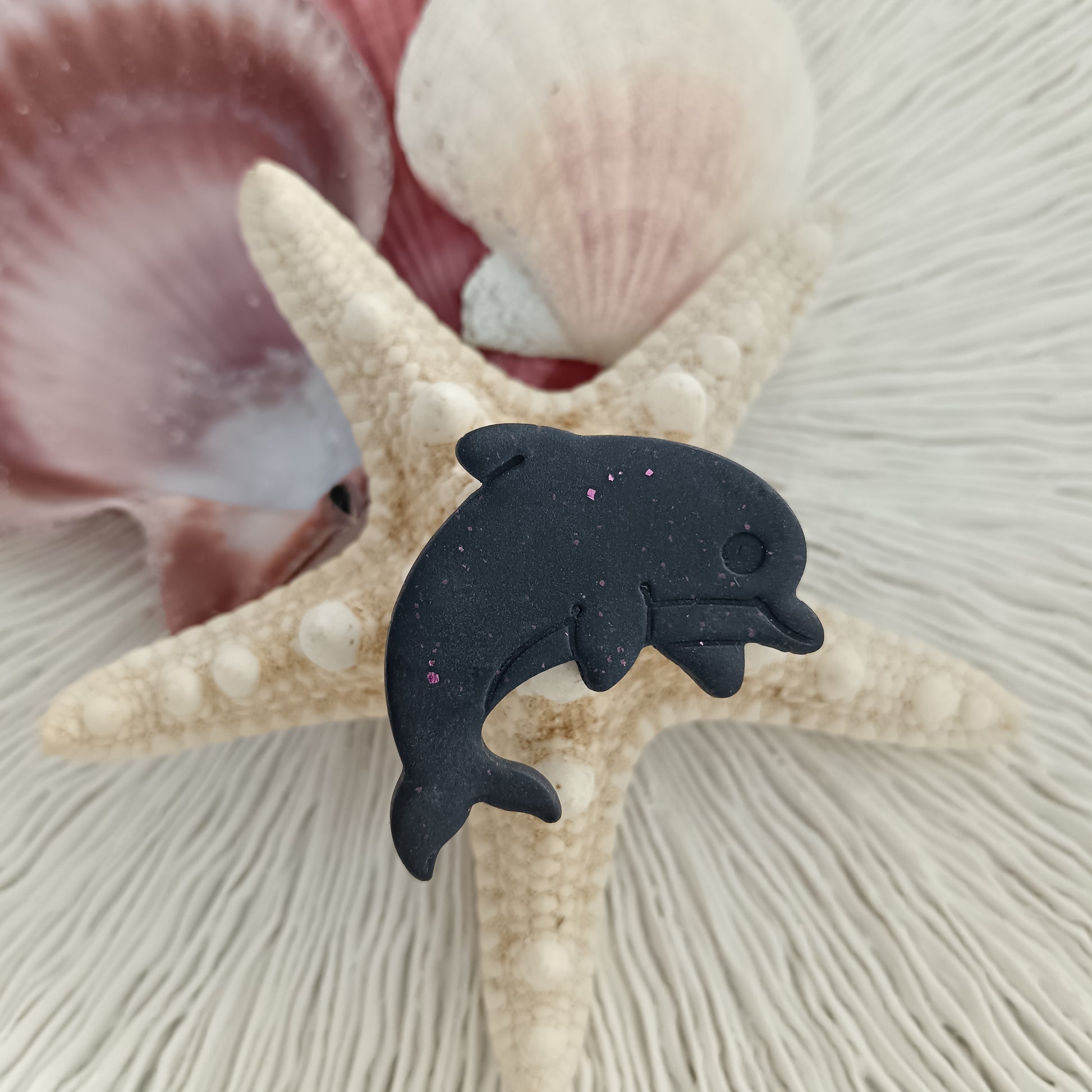 This sweet little dolphin is sculpted from polymer clay with smooth, simple detailing and just the right touch of glittery fun β not too flashy, just enough to catch the light and brighten your day.