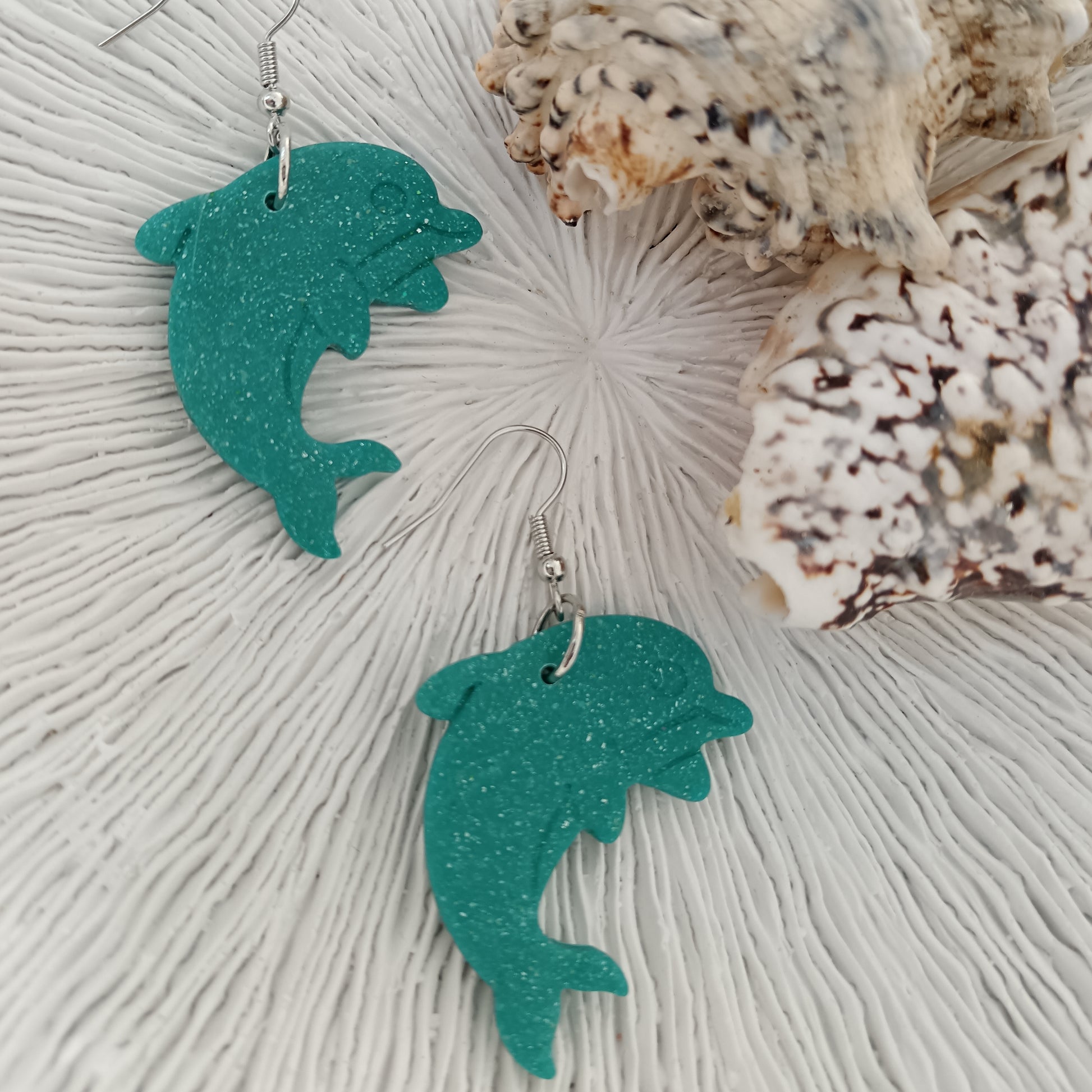 Handcrafted from polymer clay in bright turquoise, each dolphin shimmers with a fine dusting of silver glitter, catching the light with every move.