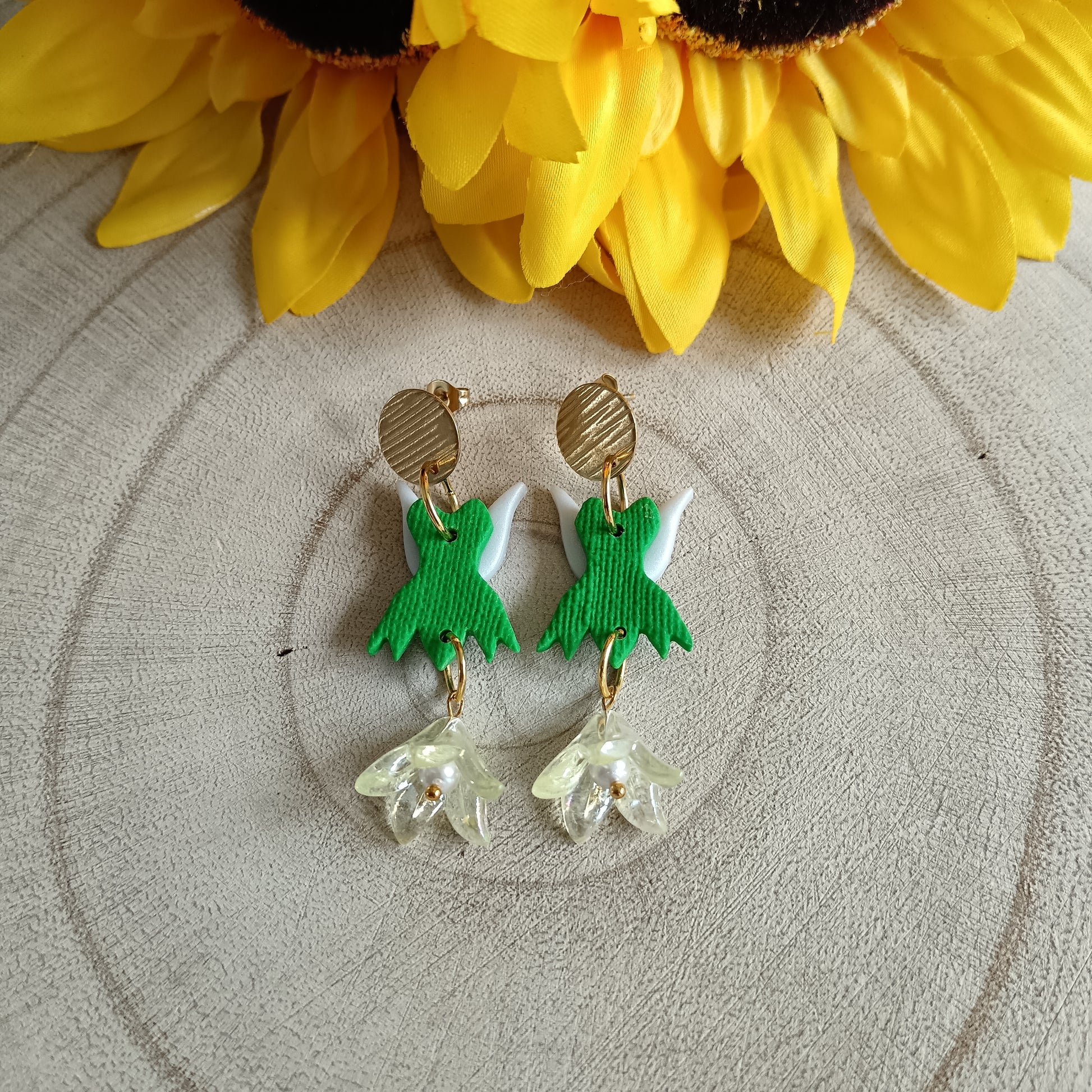 Handcrafted from polymer clay, each stud features a sweet bell-shaped flower paired with iridescent wings. Inspired by the gentle charm of fairy folklore, these earrings are a whimsical blend of nature, magic, and delicate sparkle.