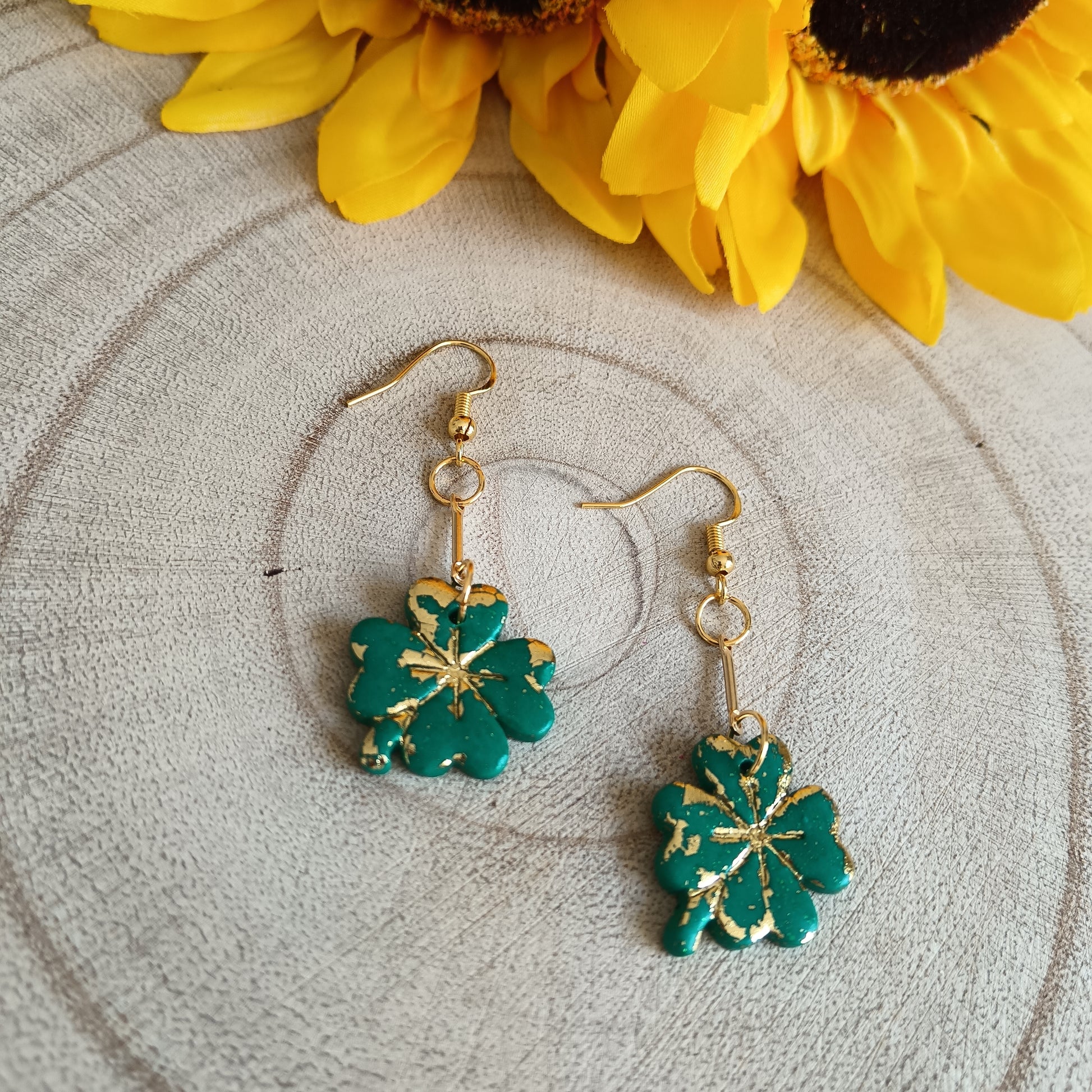 Handcrafted with rich green polymer clay and accented with shimmering gold details, these beauties are more than just accessories—they’re little four-leaf statements of good vibes and bold style 🍃💫.