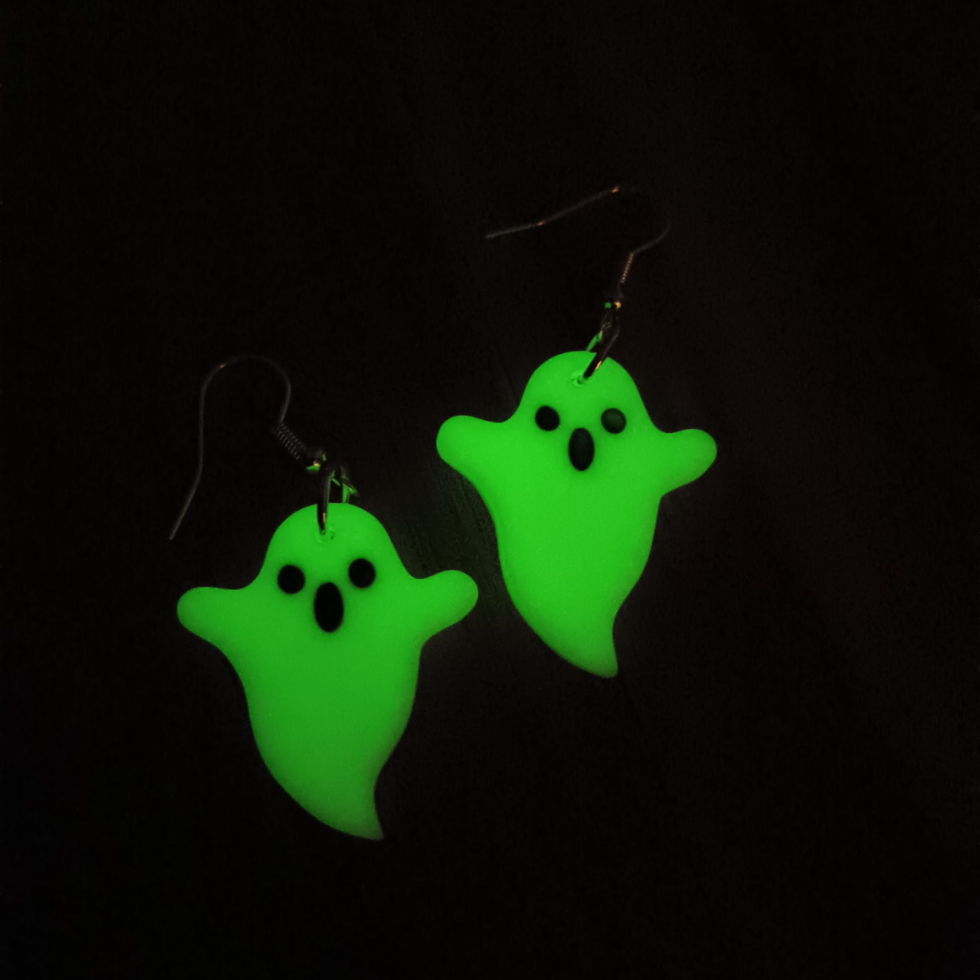 Suspended from elegant 925 Sterling Silver Hooks, these ghosts come to life at night (or under UV light), glowing softly as they sway.