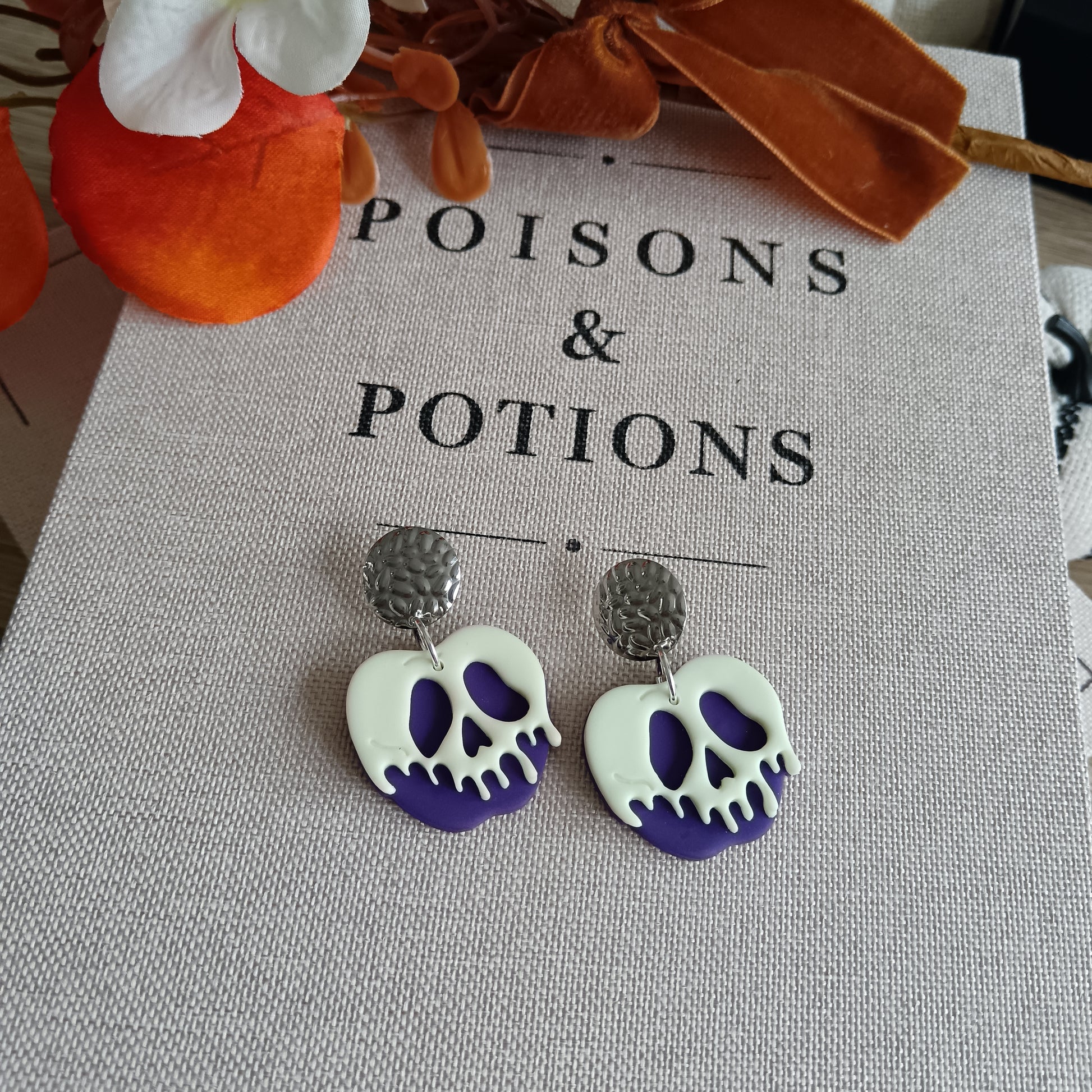 The Witch’s Bite earrings are haunted apples hand-sculpted in deep purple & glow-in-the-dark polymer clay — with a ghostly drip effect that whispers of curses, cauldrons, and forbidden fruit.