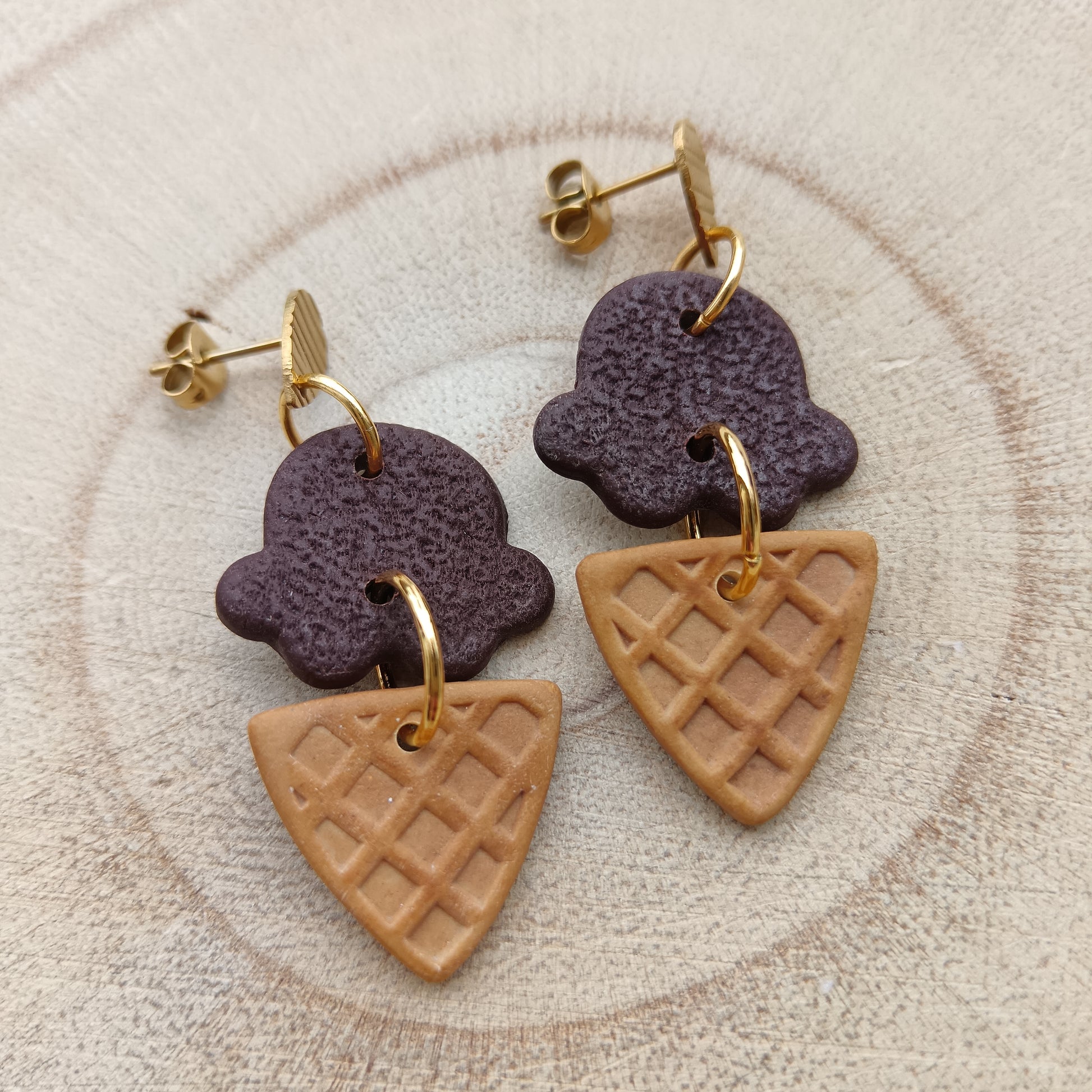 Handcrafted from polymer clay, each earring features two separate pieces: a golden waffle cone and a smooth, cocoa-toned scoop on top.