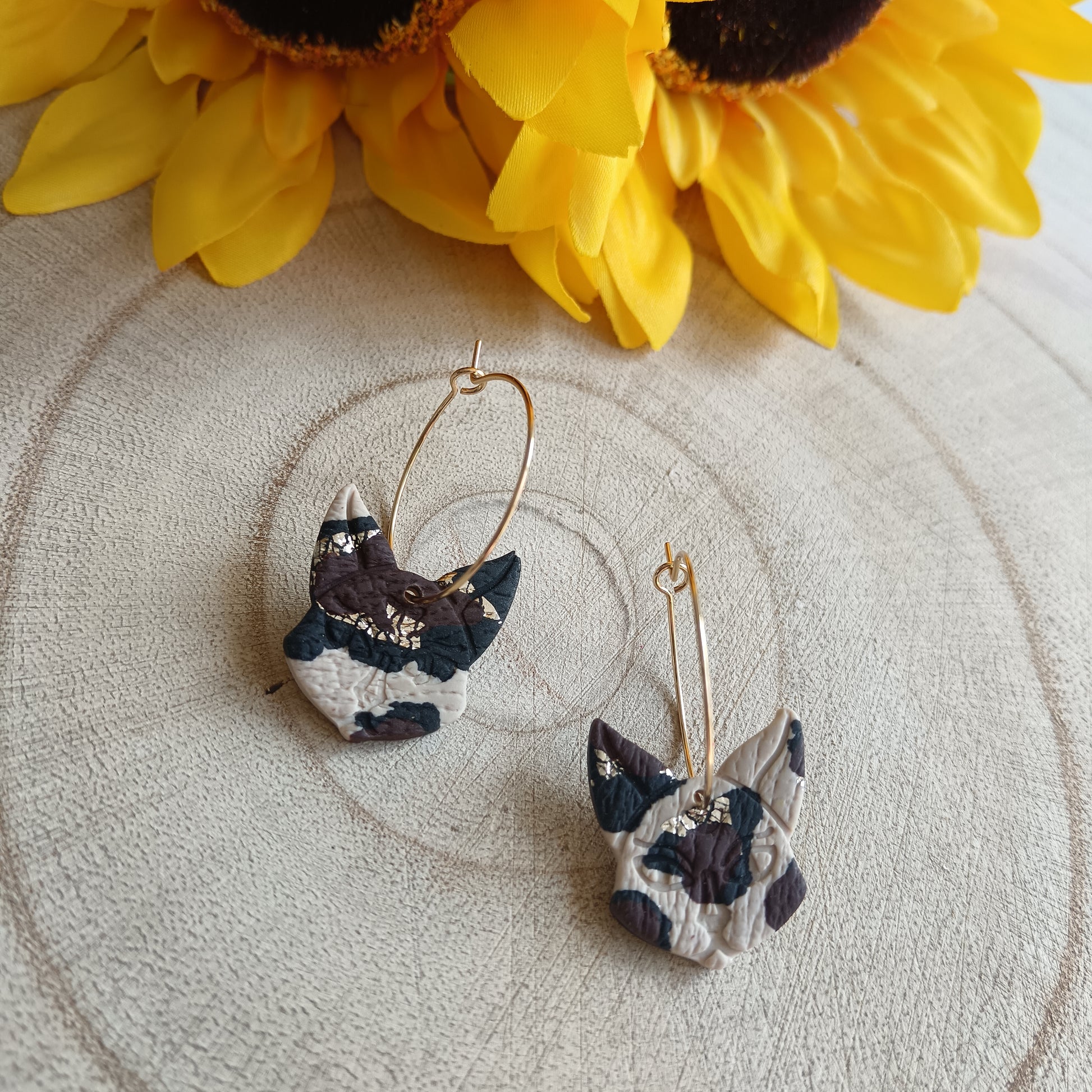 On 25mm Gold Stainless Steel Hoops and handcrafted with polymer clay, these earrings feature an adorable cat-shaped design adorned with a stunning leopard print pattern.