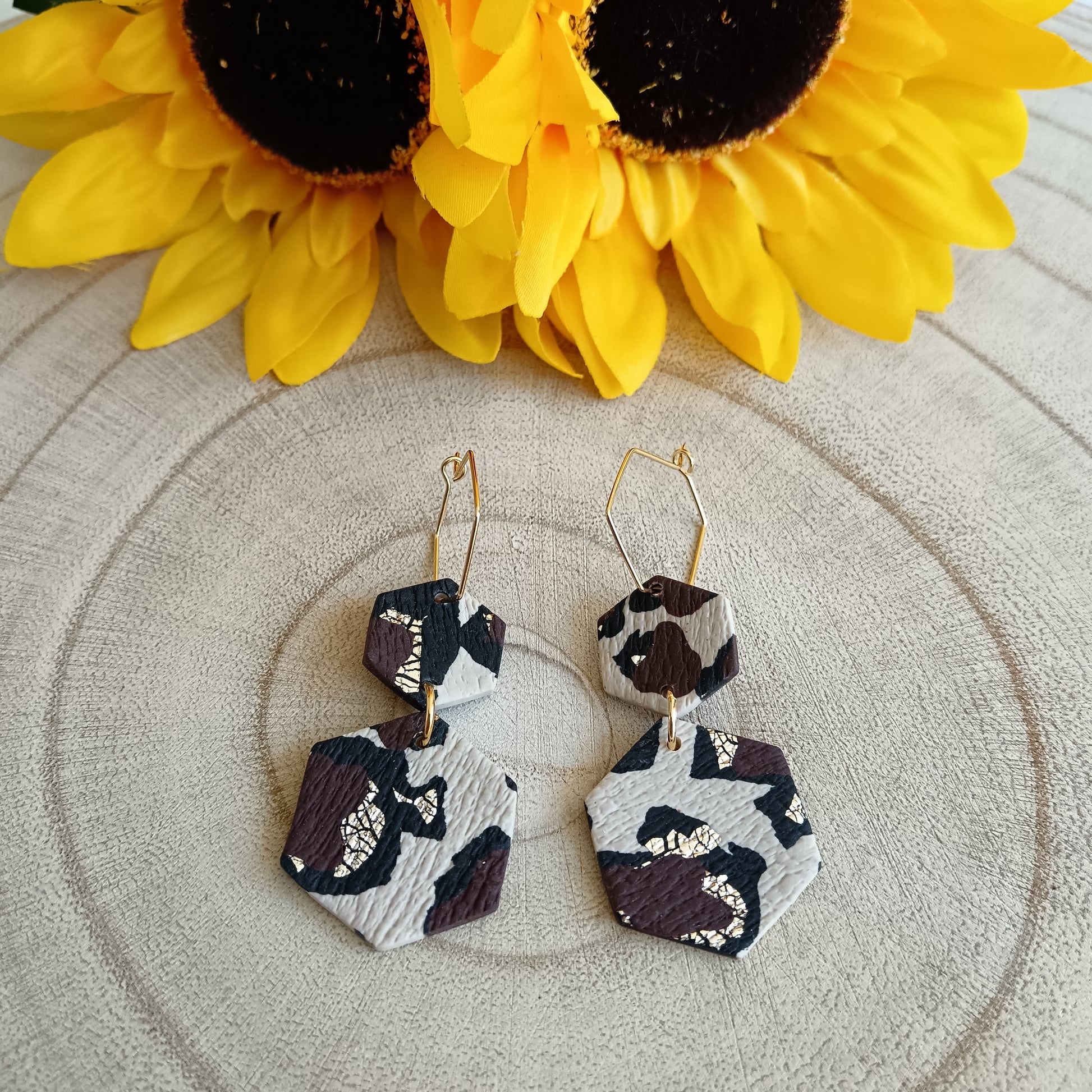 On 20mm Gold Plated Hexagon Hoops and handcrafted with polymer clay, these earrings feature a stunning leopard print design that’s both bold and elegant.