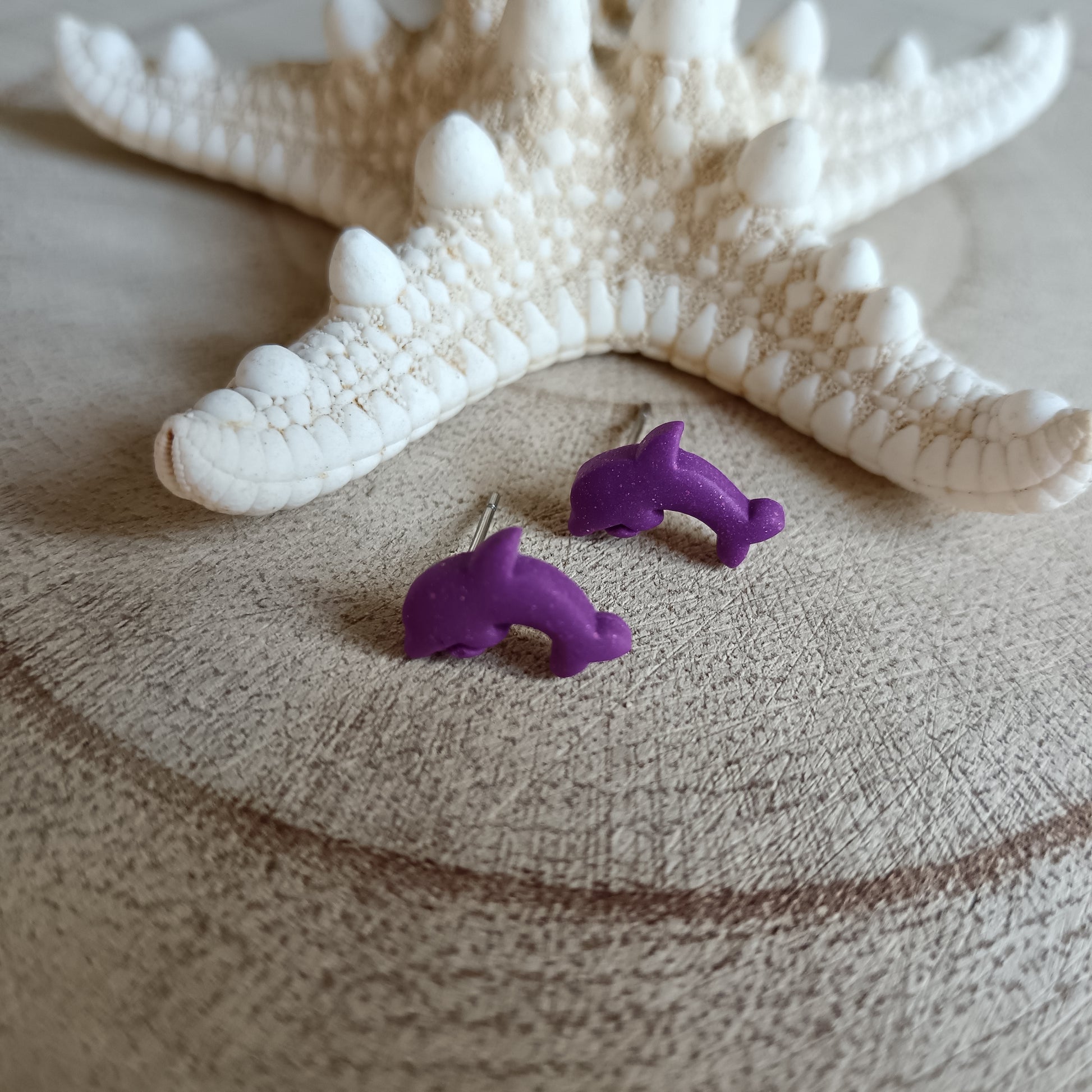 Each micro stud features an adorable dolphin silhouette, sculpted from lightweight polymer clay in a rich purple hue with just the right touch of pink shimmer to catch the light when you move.