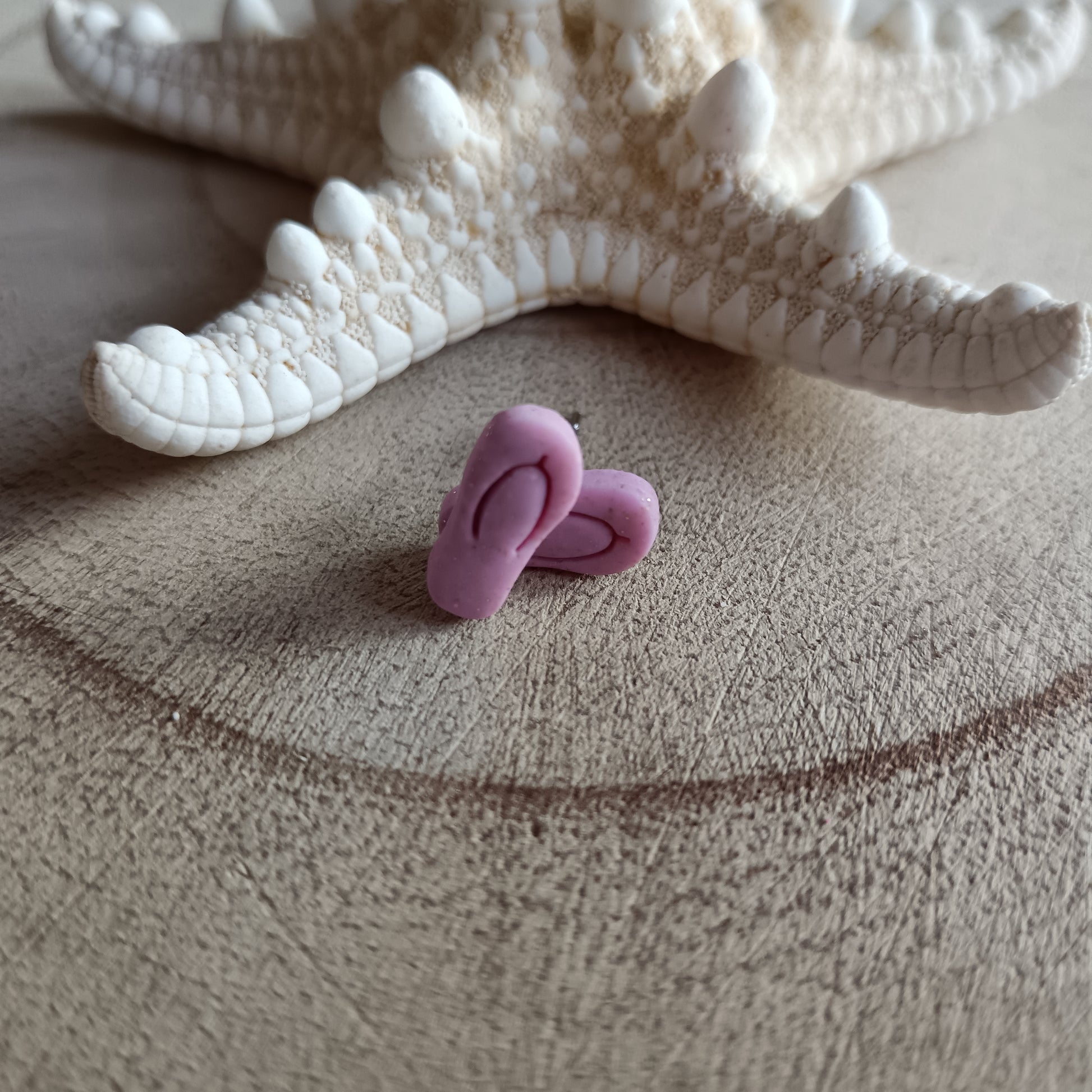 Handcrafted from polymer clay in a soft baby pink shade, each mini flip flop is dusted with delicate mica powder for a gentle, pearly glow.