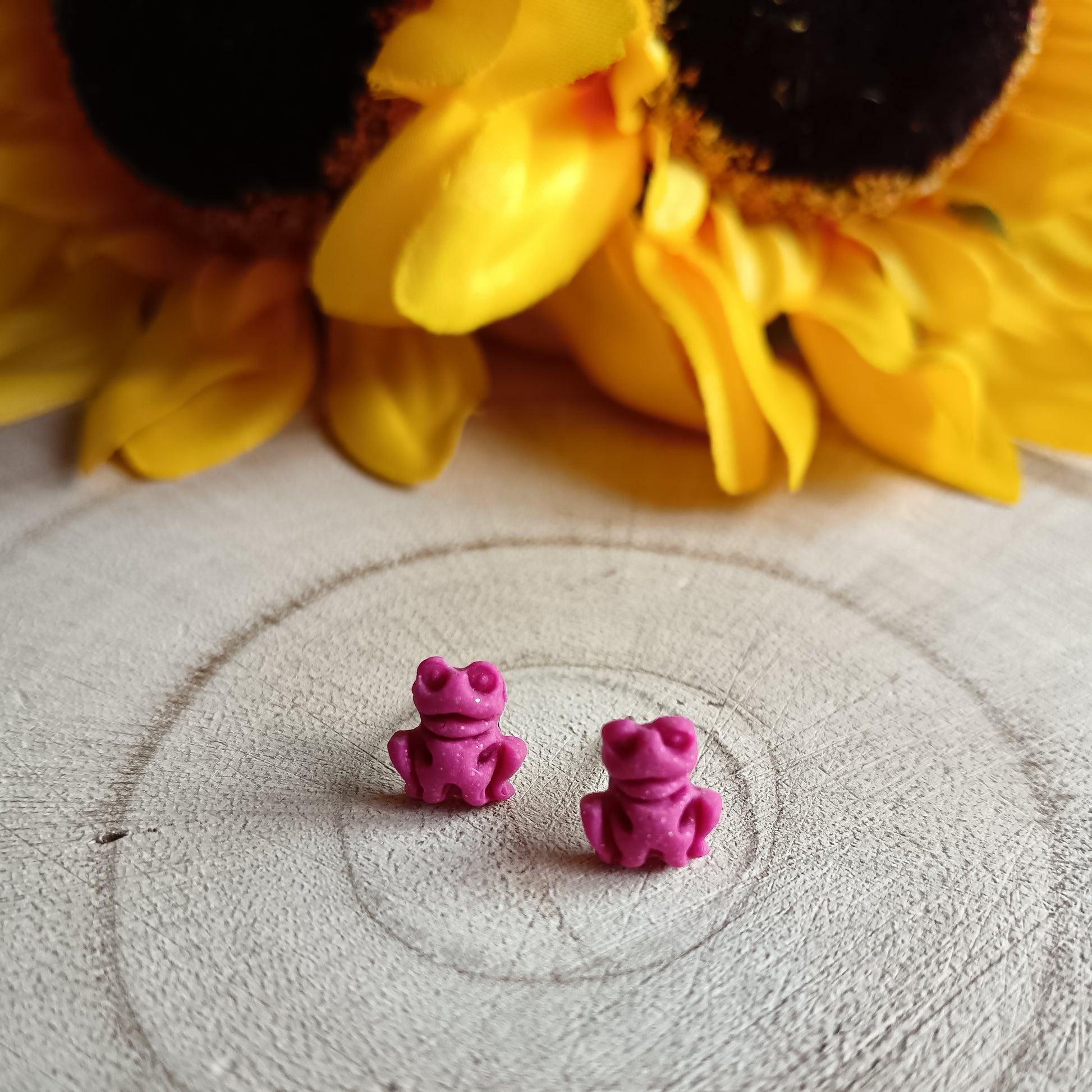 Each tiny frog is handcrafted from polymer clay in a vibrant hot pink shade and finished with a soft shimmer of mica powder that catches the light beautifully.