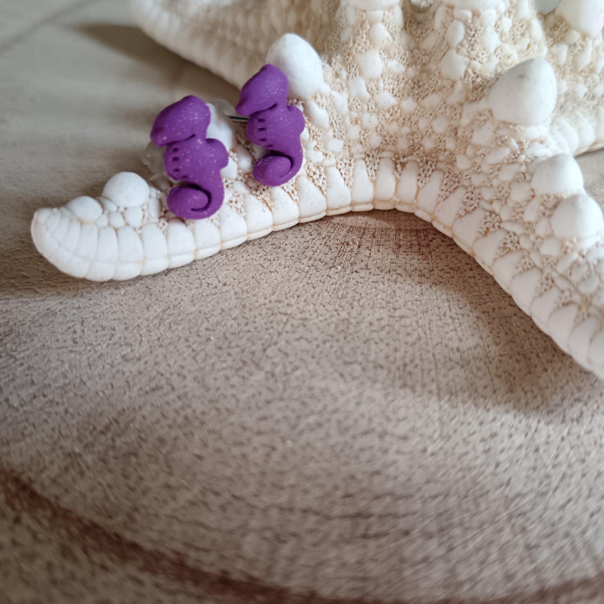 Each dainty seahorse is handcrafted from polymer clay in a rich purple hue and finished with a soft shimmer of pink mica powder.