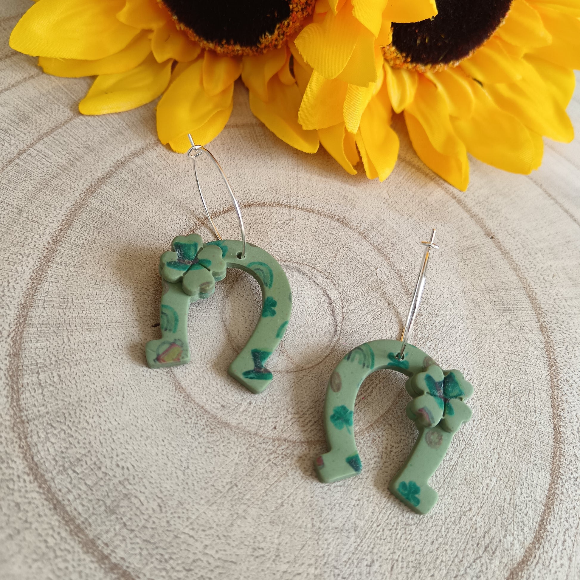 Handcrafted from lightweight polymer clay and printed with classic Irish charm, each pair features a horseshoe-shaped design topped with a sweet little four-leaf clover 🌿—because one lucky symbol just isn’t enough!