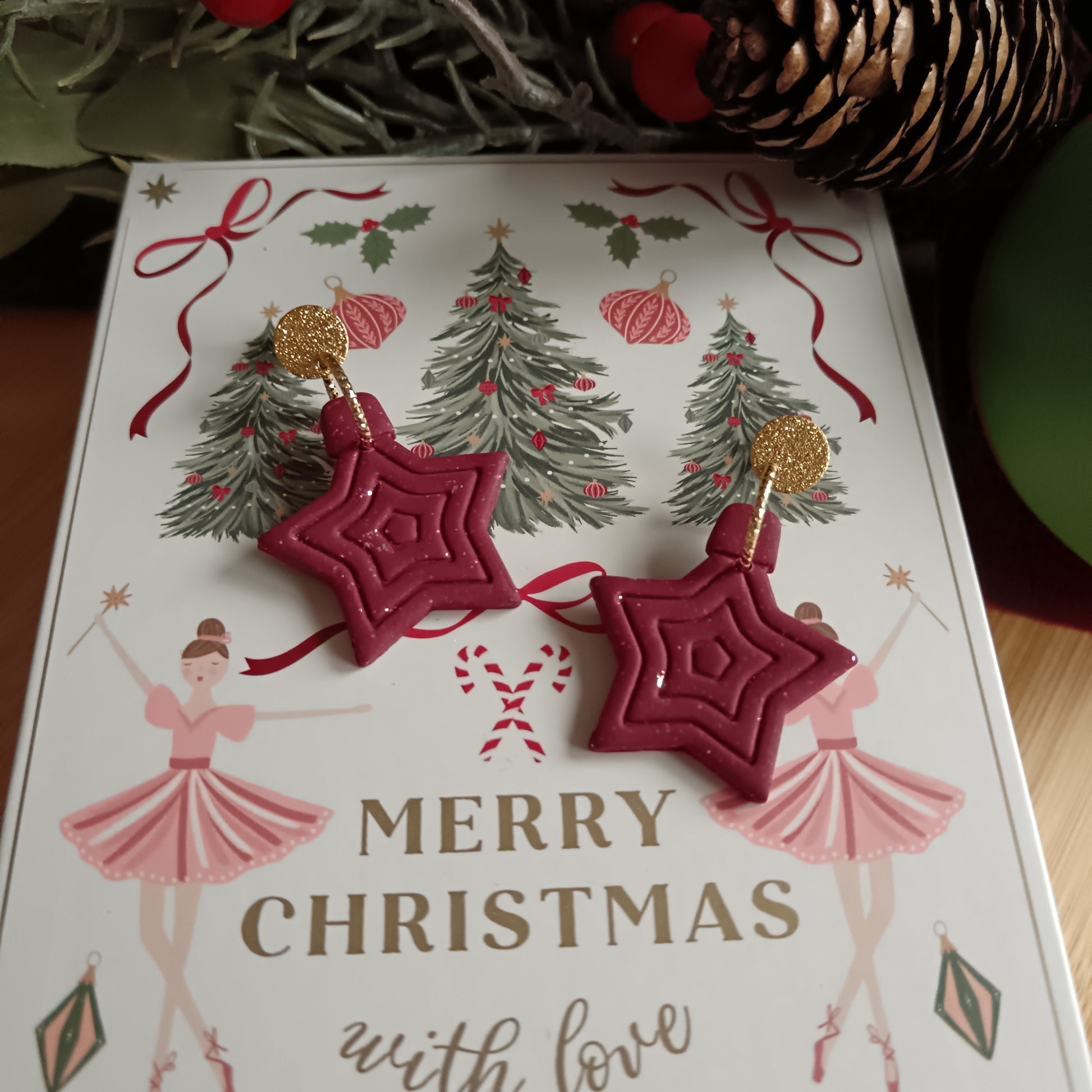 These burgundy and gold star-shaped baubles are handcrafted from polymer clay, blending rich, warm burgundy with shimmering gold accents.