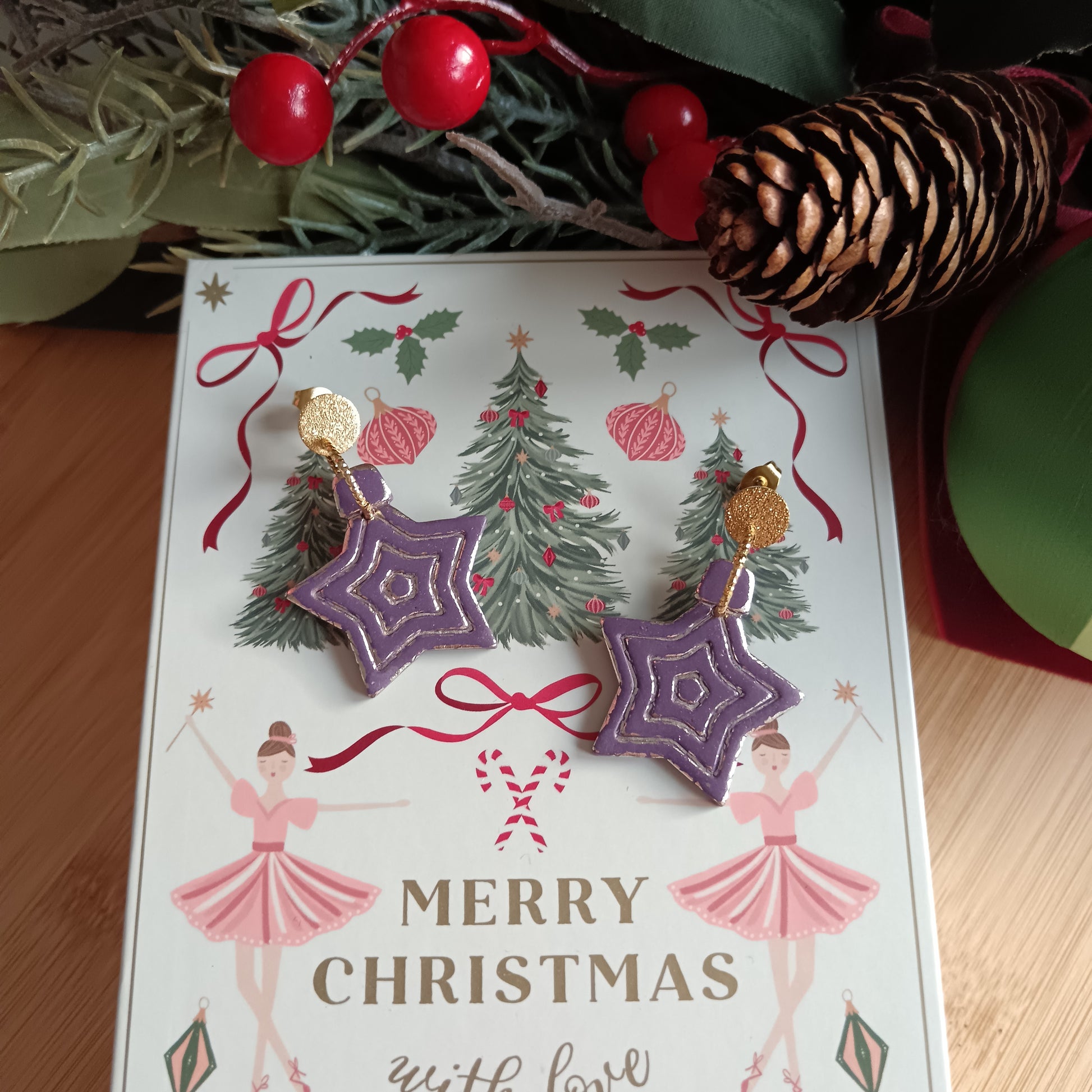 Christmas Star Bauble Purple & Gold Dangle Stud Earrings