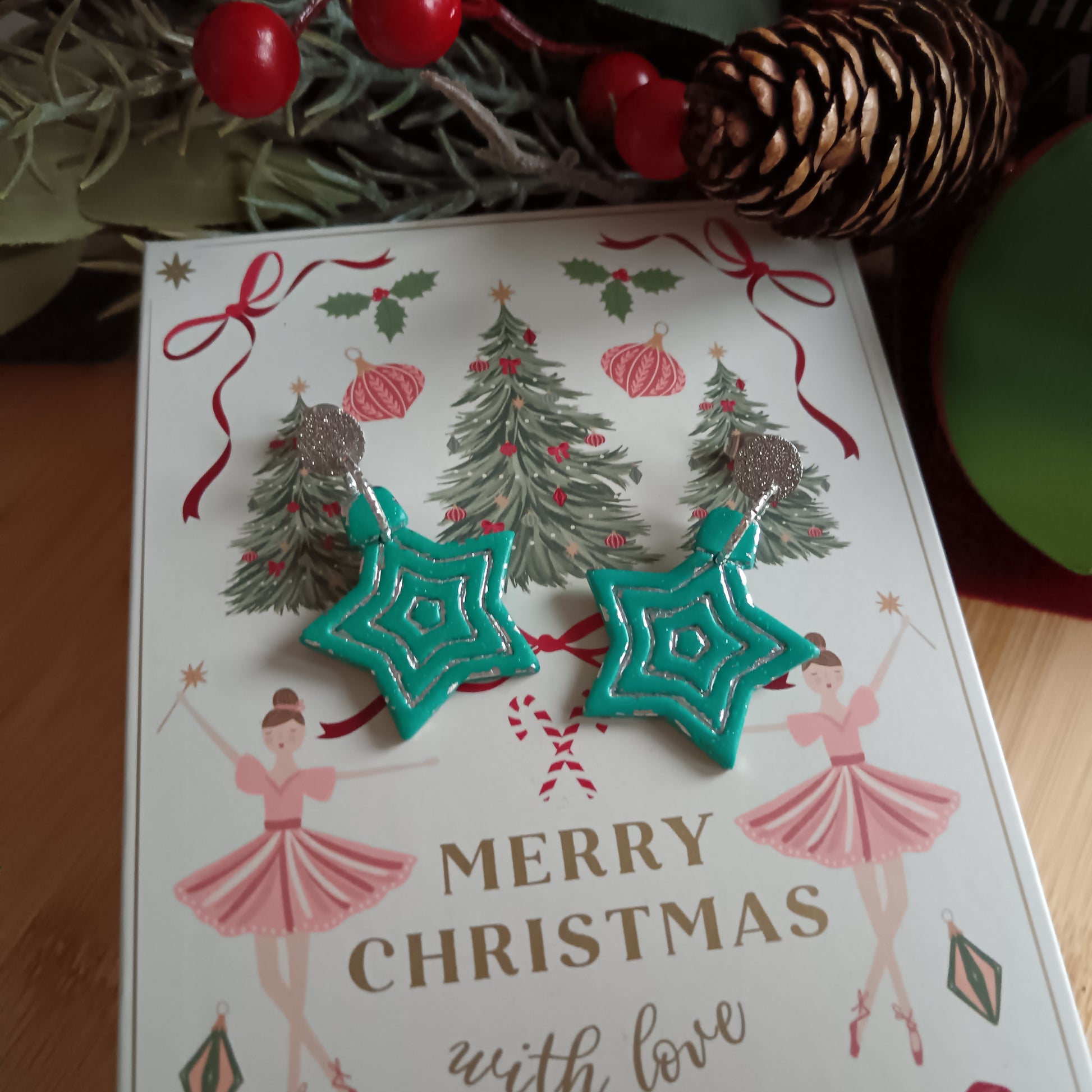 These turquoise and silver star-shaped baubles are handcrafted from polymer clay, combining cool turquoise tones with shimmering silver accents.