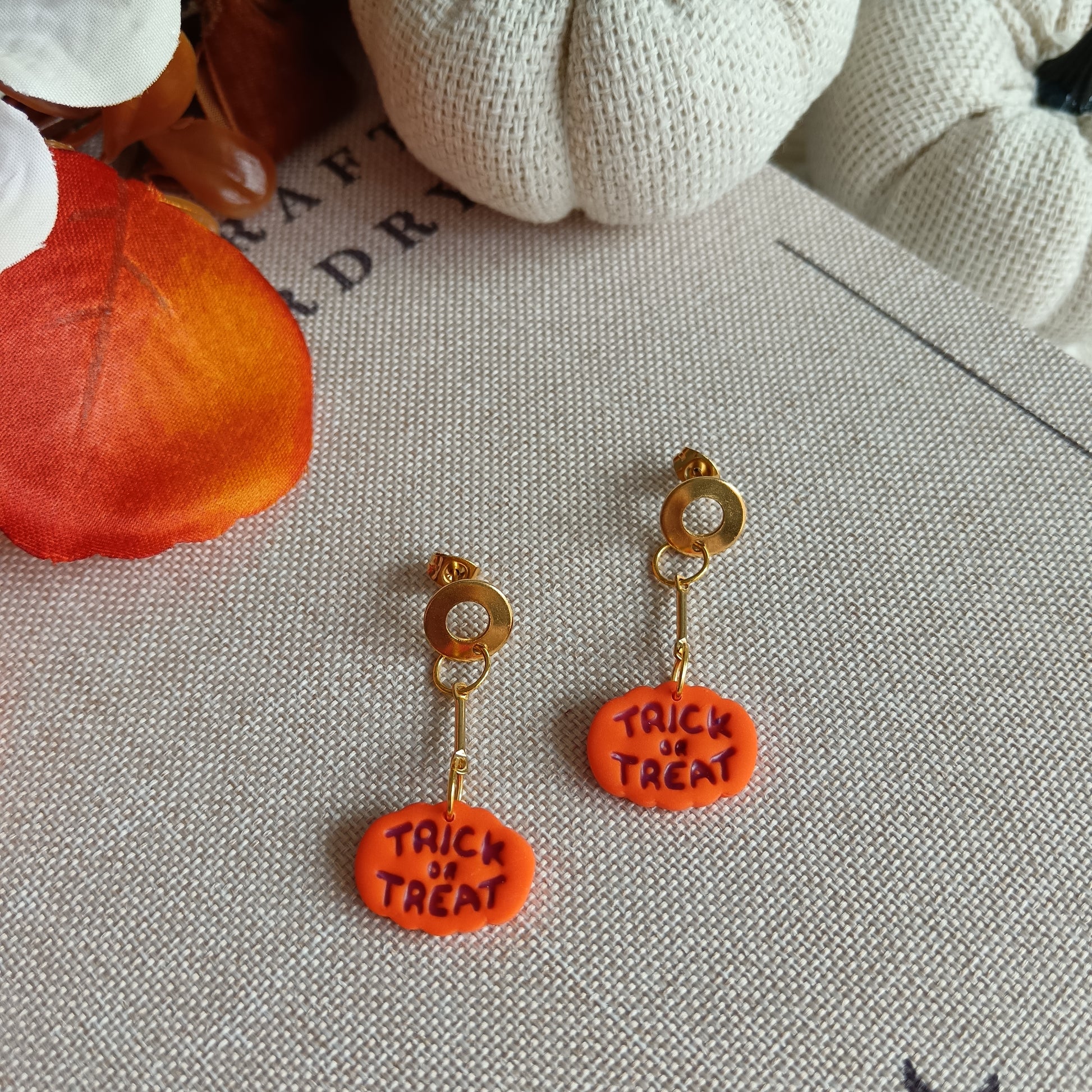 The Trick or Treat earrings are the perfect pop of pumpkin-spiced fun — hand-sculpted in rich orange polymer clay and embossed with the classic Halloween phrase, “Trick or Treat”, across each pumpkin’s surface.