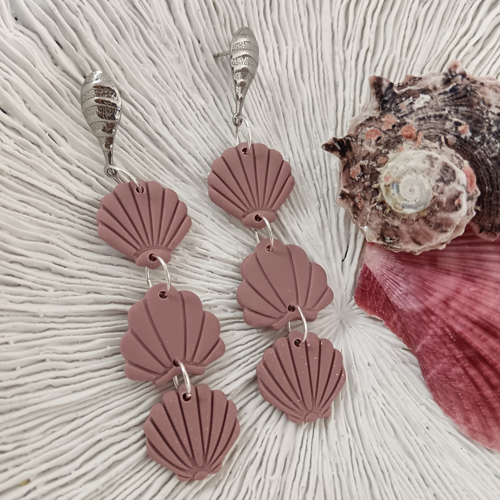 These handcrafted studs feature three delicate clay shells dancing in a soft dusky pink β stacked just right for a breezy, beach-kissed look.